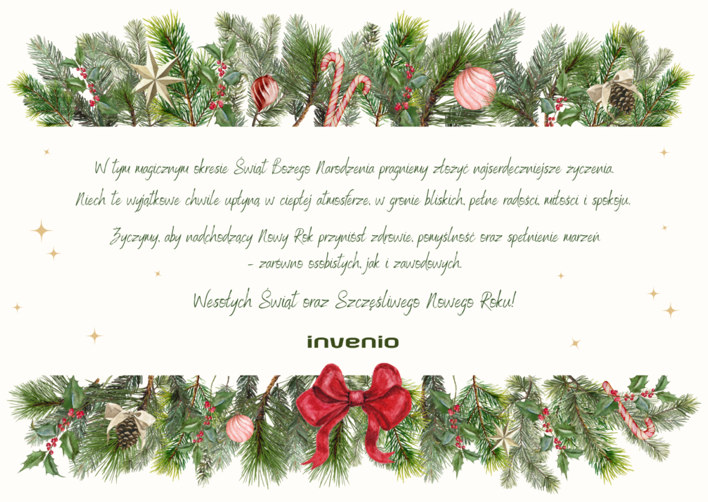 W tym magicznym okresie Świąt Bożego Narodzenia pragniemy złożyć najserdeczniejsze życzenia. Niech te wyjątkowe chwile upłyną w ciepłej atmosferze, w gronie bliskich, pełne radości, miłości i spokoju. Życzymy, aby nadchodzący Nowy Rok przyniósł zdrowie, pomyślność oraz spełnienie marzeń – zarówno osobistych, jak i zawodowych. Wesołych Świąt oraz Szczęśliwego Nowego Roku!